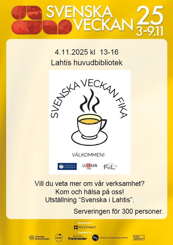 Nyt vietetään Svenska veckania! Yhdistyksemme on mukana Lahden pääkirjastolla, Kirkkokatu 31 tiistaina 4.11. klo 13-16 kertomassa toiminnastaan. Tervetuloa!